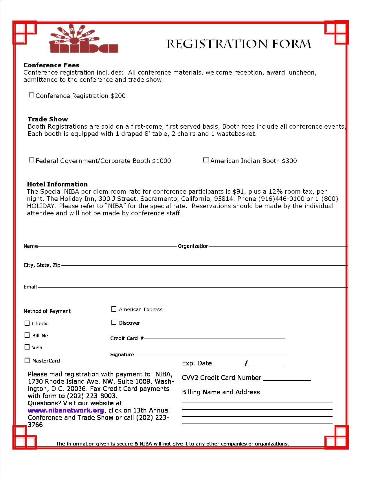 Location: Sacramento, California Hotel: Holiday Inn 300 J. Street Sacramento, CA. 95814 (916) 446-0100 or 1-800-holiday Dates: November 20, 21, 22, 2005 Be part of the excitement as we meet in Sacramento, California for a gathering of Tribal Leaders, Native Businesses, Corporate America, Federal Agencies, Contractors, and Congressional Representatives. Conference Fees Conference registration includes: All conference materials, welcome reception, award luncheon, admittance to the business and trade show. $200 Conference Registration Trade Show Registration Booth Registration are sold on a first-come, first served basis, Booth fees include all conference events. Each booth is equipped with 1 draped 8' table, 2 chairs and 1 wastebasket. $300 Tribes/American Indian Booth $1000 Federal Government/Corporate Booth Hotel Information: The Special NIBA per diem room rate for conference participants is $91, plus a 12% room tax. Holiday Inn 300 J. Street Sacramento, CA. 95814 (916) 446-0100 or 1-800-holiday Please refer to NIBA for the special rate. Reservations should be made by the individual attendee and will not be made by conference staff. NATIONAL INDIAN BUSINESS ASSOCIATIONExhibit Agenda – November 20, 21, 22, 2005Sunday, November 20, 2005